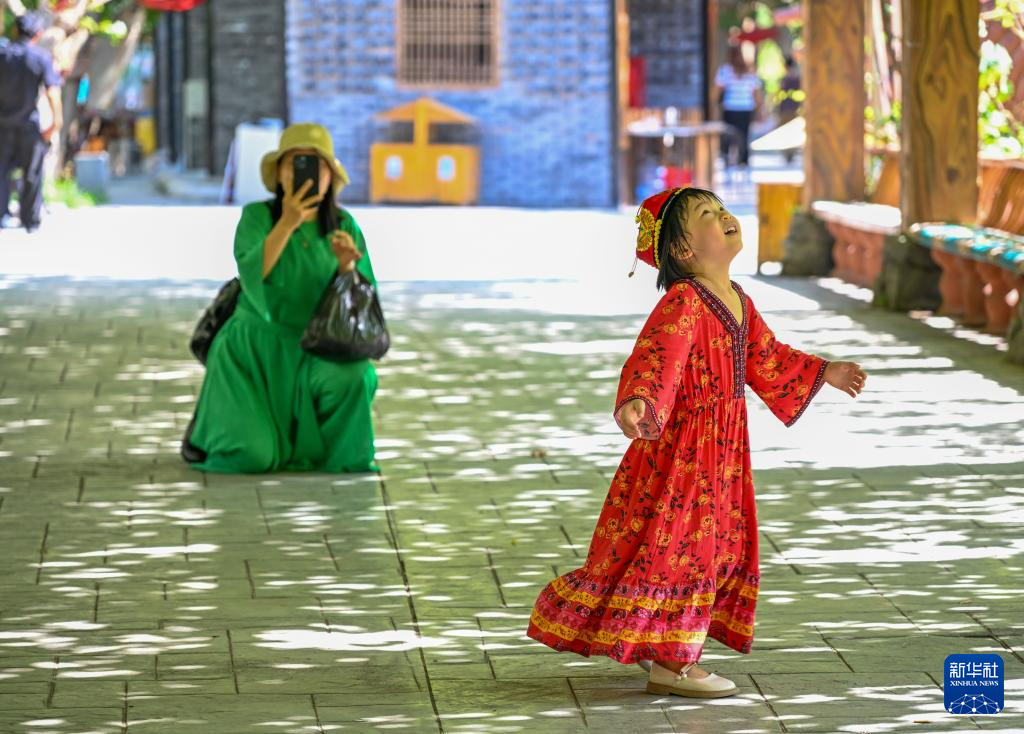 8月17日,游客在葡萄沟景区葡萄长廊下拍照留念。