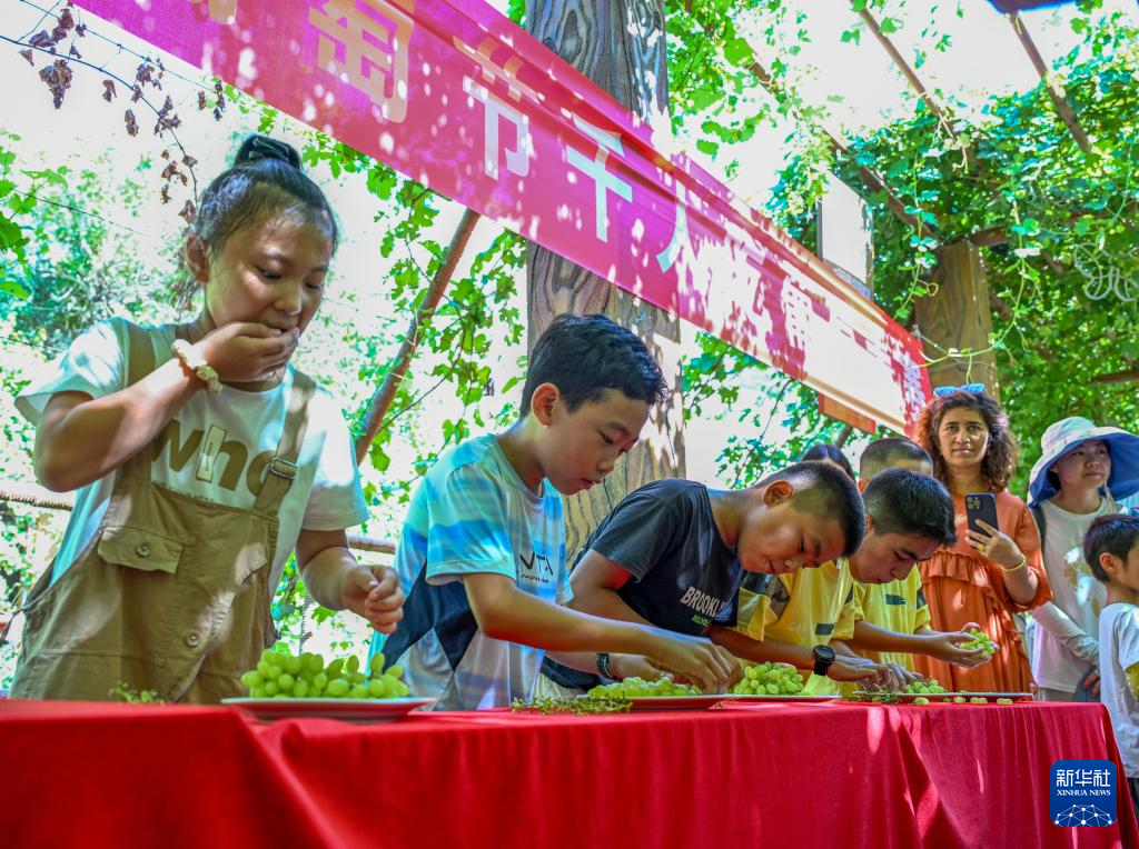 8月17日,游客在葡萄沟景区参加吃葡萄大赛。