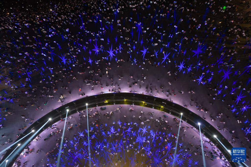 7月6日,人们在哈尔滨国际啤酒节现场观看无人机表演(无人机照片)。