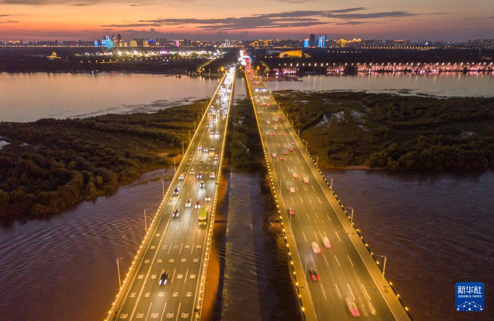 8月15日,车辆在晚霞映照的哈尔滨松花江公路大桥上行驶(无人机照片)。