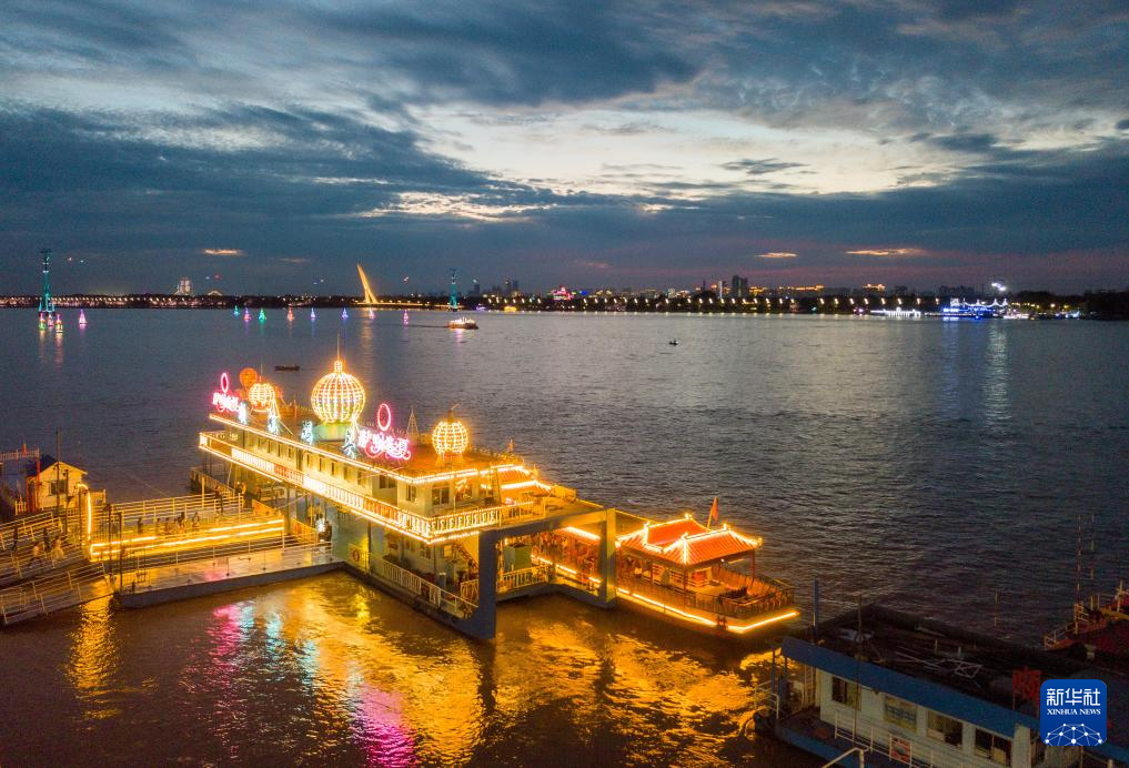 8月14日,松花江哈尔滨段上演帆船灯光秀(无人机照片)。