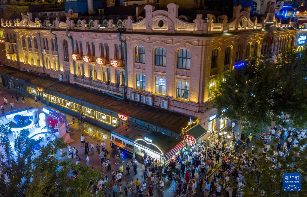 8月14日,人们在百年老街中央大街上的马迭尔冷饮厅购买特色食品(无人机照片)。