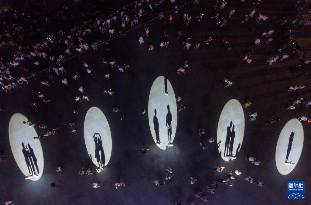 8月14日,人们在哈尔滨防洪纪念塔广场体验光影秀(无人机照片)。