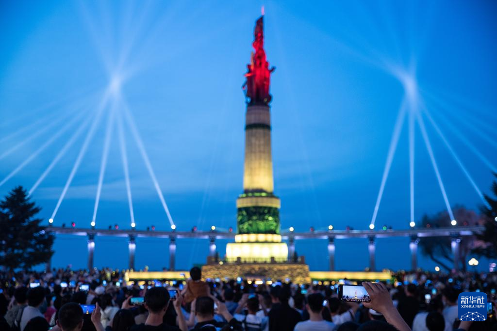 5月3日,人们在哈尔滨市防洪纪念塔广场上拍摄哈尔滨松花江光影秀。