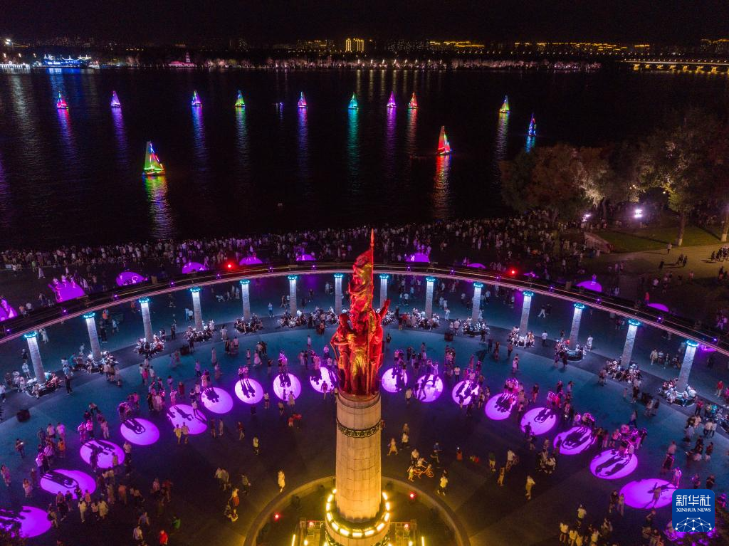 8月14日,人们在哈尔滨防洪纪念塔广场体验光影秀,帆船光影秀同时在松花江面上演(无人机照片)。