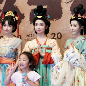 8月20日,小女孩与敦煌服饰扮装者合影。