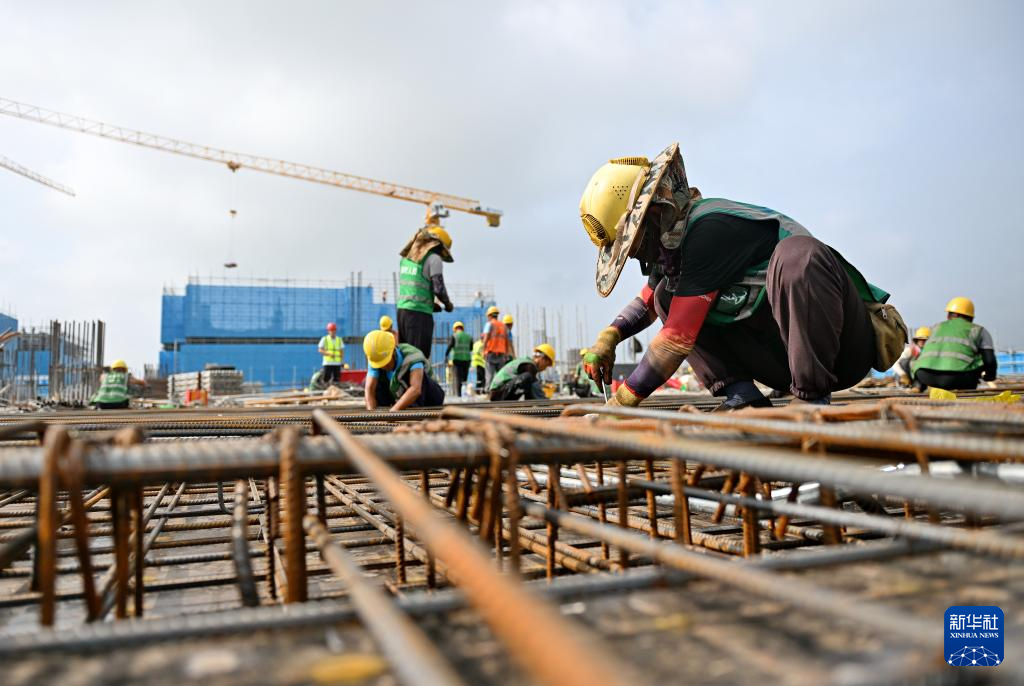 8月21日,中建三局工人在雄安科创中心二期、三期项目建设现场捆绑钢筋。