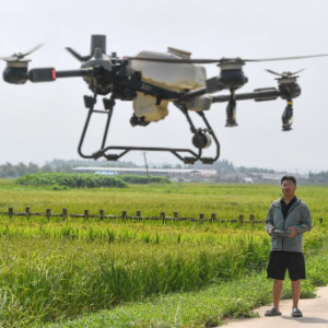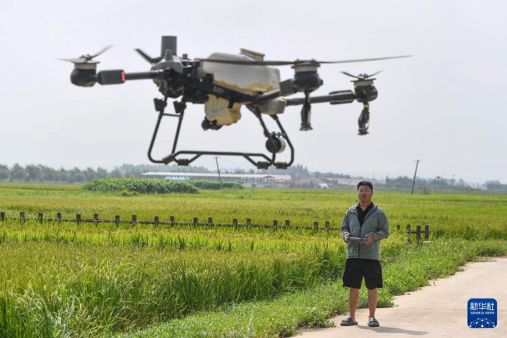 8月20日,在位于吉林省永吉县一拉溪镇的九月丰家庭农场,植保无人机为水稻施肥。