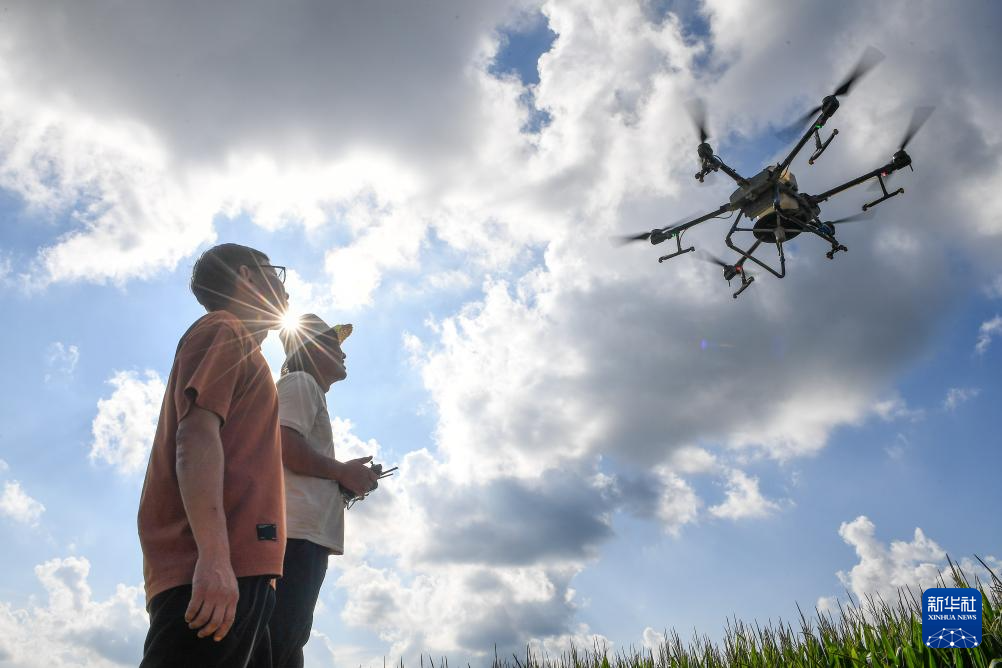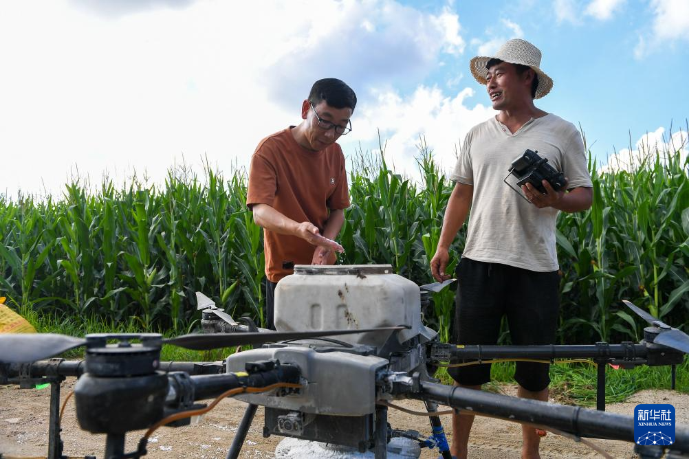 8月8日,在吉林省梨树县孤家子镇,孤家子镇农业发展服务站高级农艺师兰雨壮(左)和无人机操作手一起查看植保无人机作业情况。