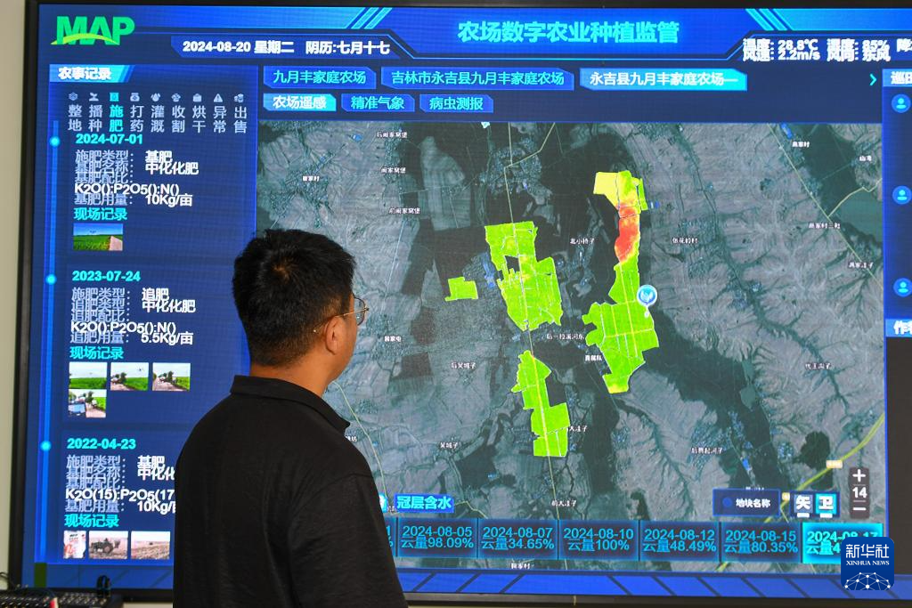 8月20日,在位于吉林省永吉县一拉溪镇的九月丰家庭农场,负责人肖瑶查看智慧农业可视化平台。