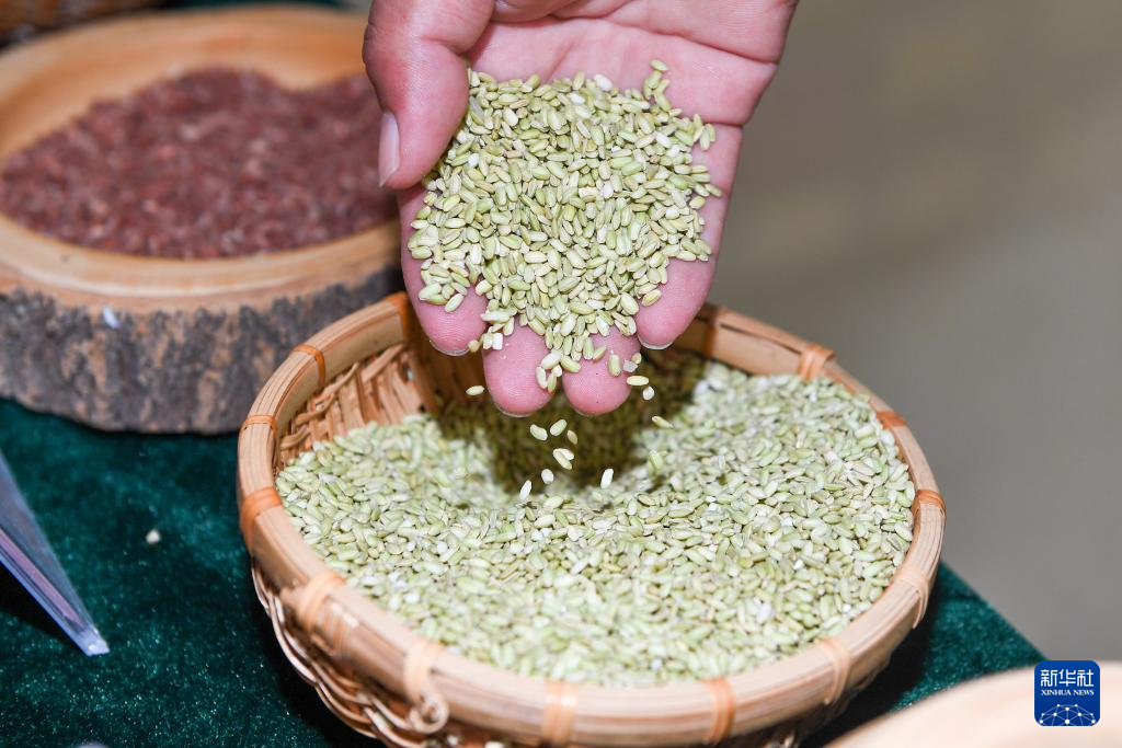 8月20日,在位于吉林省永吉县一拉溪镇的九月丰家庭农场,负责人肖瑶展示特色新品种稻米。