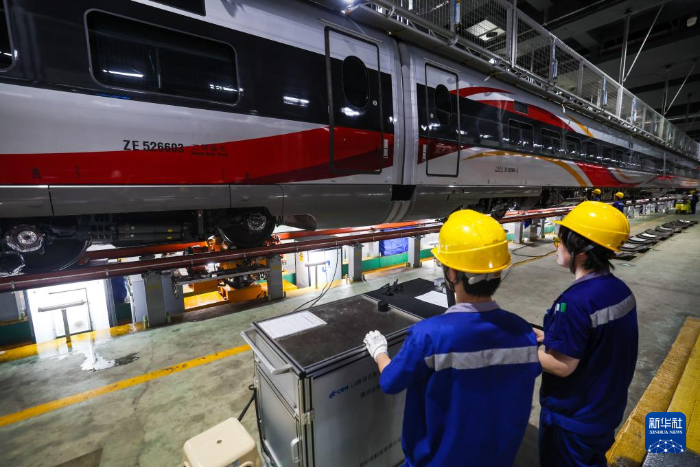 8月21日,杭州西动车运用所的铁路机械师对杭温高铁试运行列车进行检修作业。