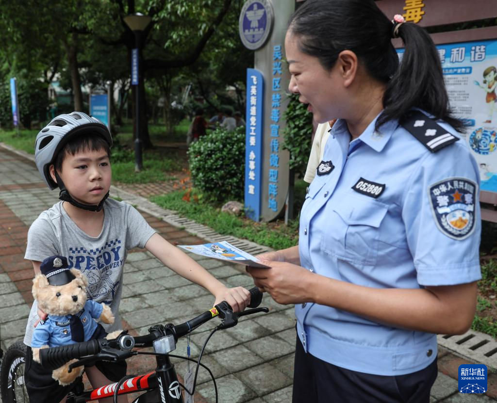 8月21日,在飞英街道的社区“有礼市集”上,飞英派出所民警给孩子讲反诈知识。