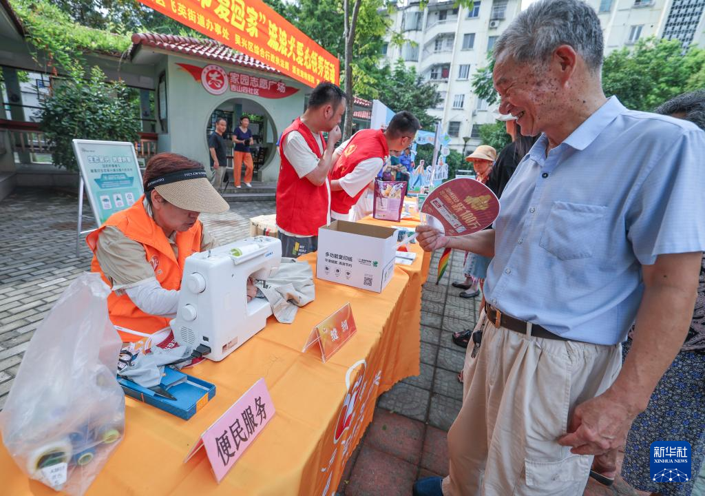 8月21日,在飞英街道的社区“有礼市集”上,志愿者为居民提供缝补便民服务。