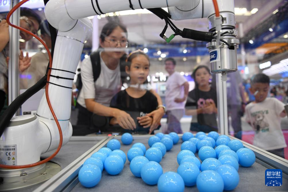 8月21日,观众在2024世界机器人大会现场体验一款可以吸取扭蛋的机器人。