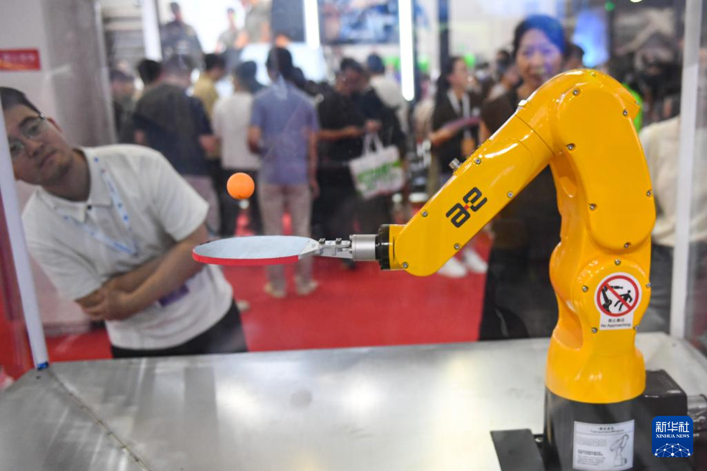 8月21日,观众在2024世界机器人大会现场观看机器人打乒乓球。