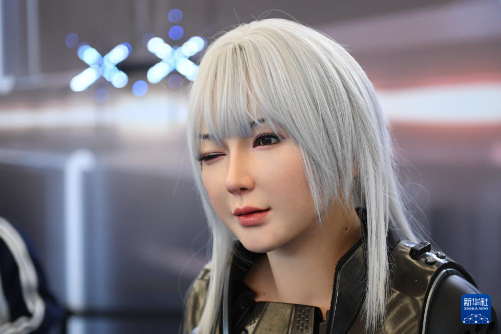 8月21日,2024世界机器人大会现场的一款多模态情感交互机器人向观众“眨眼”。