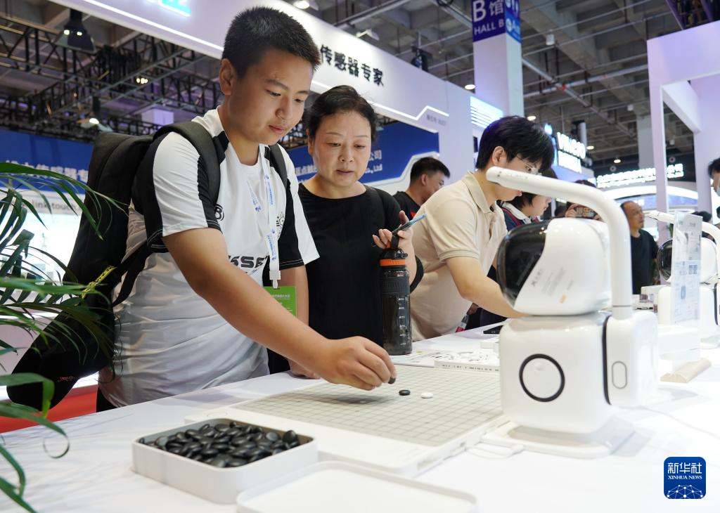 8月21日,观众在2024世界机器人大会上与机器人下棋。