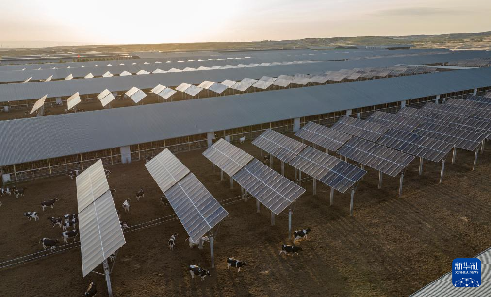 这是8月20日在宁夏灵武市白土岗高标准奶牛养殖基地的一家牧场内拍摄的“牧光互补”项目光伏发电站(无人机照片)。