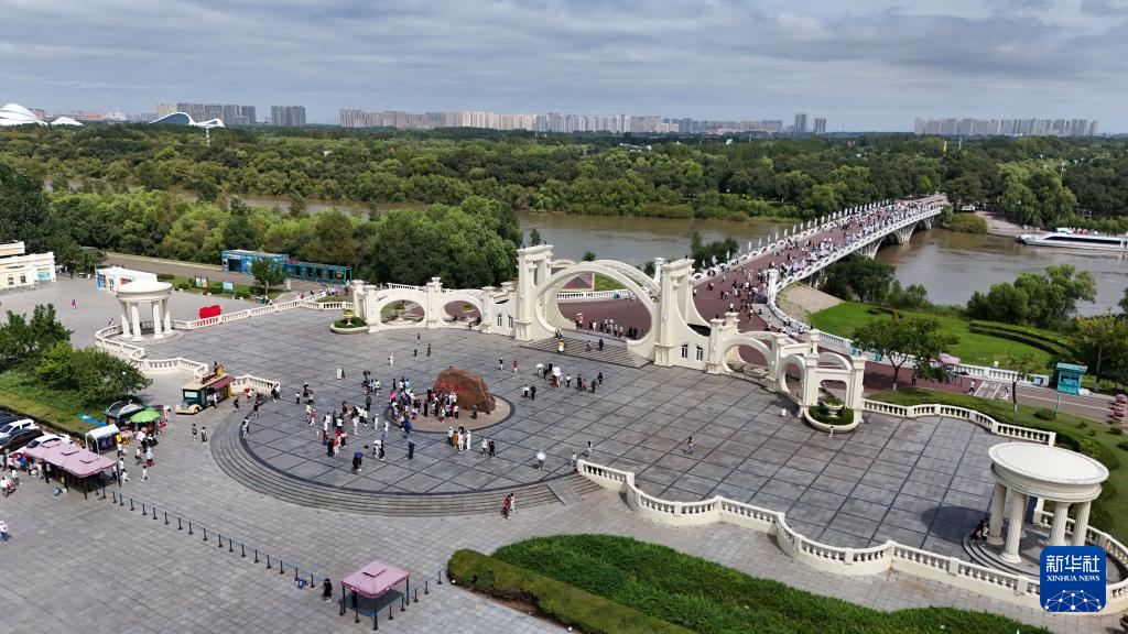 8月20日,游人在太阳岛风景区太阳石广场留影(无人机照片)。