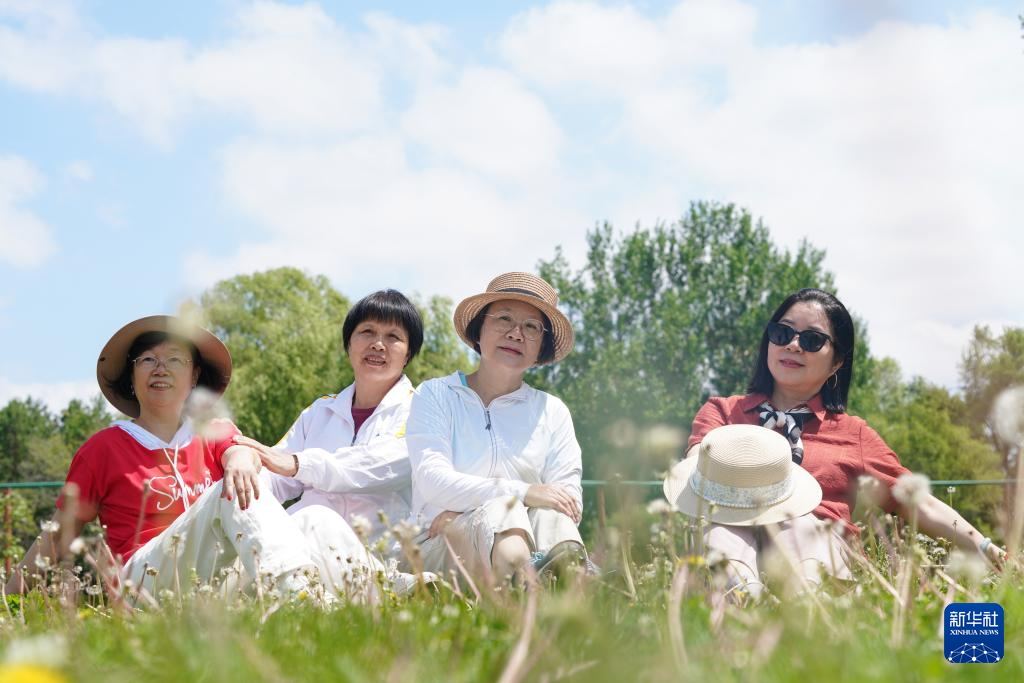 游人在太阳岛国家级风景名胜区拍照留念(6月4日摄)。