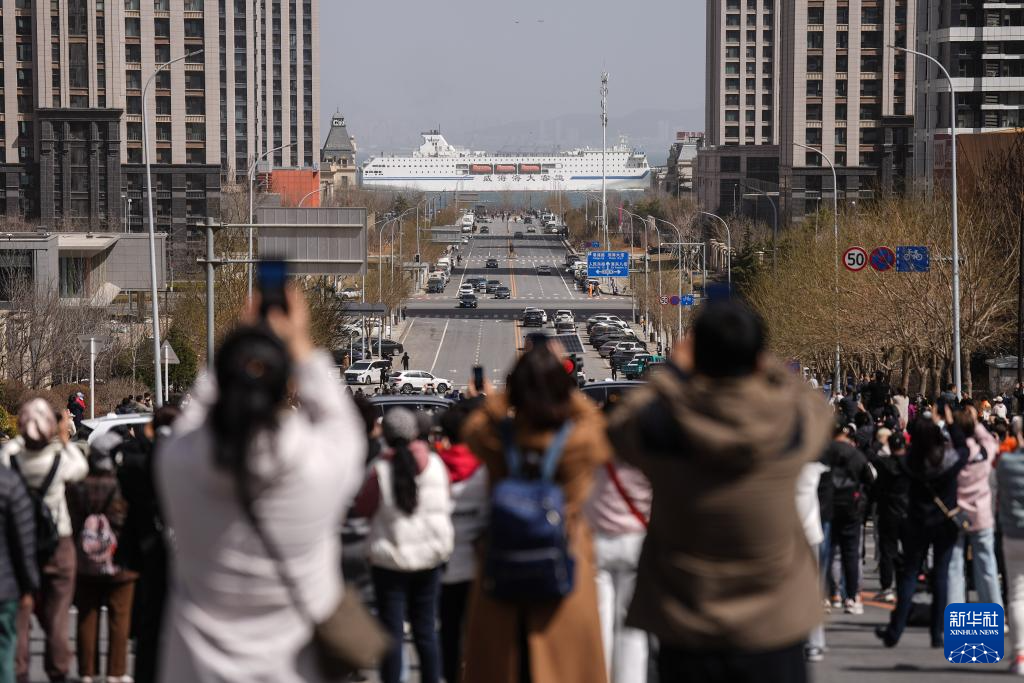 客轮通过大连港东五街附近的海域(2024年3月29日摄)。
