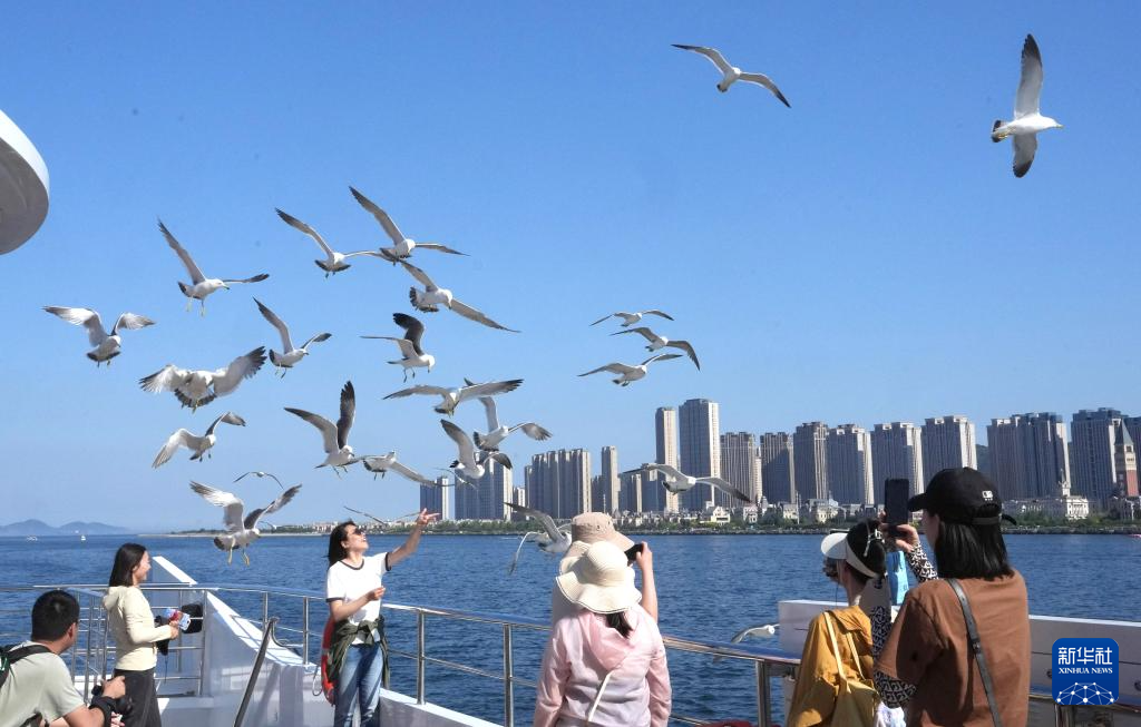 在辽宁省大连市东港商务区,游客在海边休闲观光(2024年4月16日摄)。