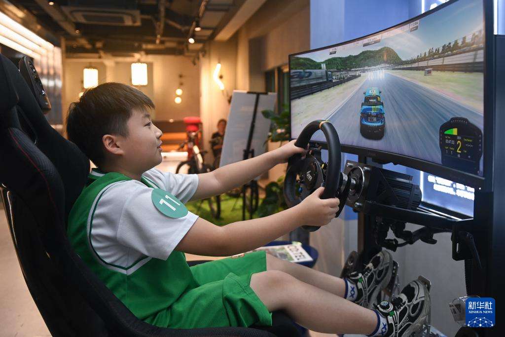8月22日,小朋友在活动现场体验模拟驾驶。