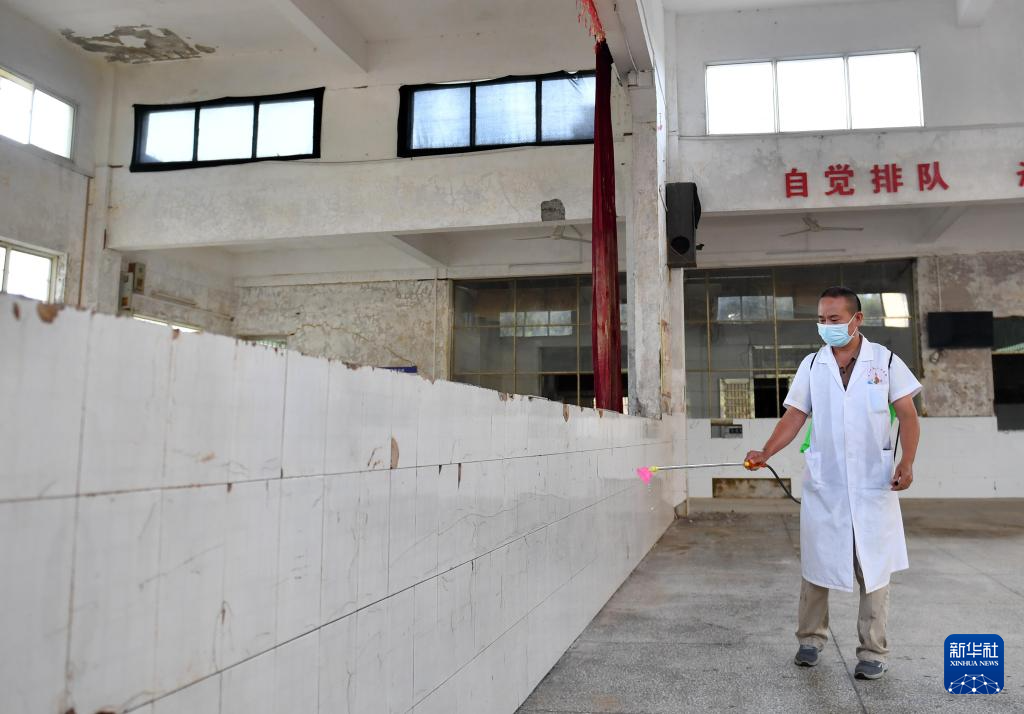 8月22日,州门司镇中心卫生院医生李雄万在资兴市州门司镇中学进行消杀。