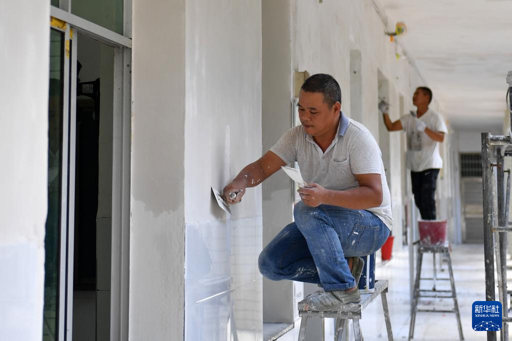 8月23日,工人们在资兴市第二中学粉刷墙面。