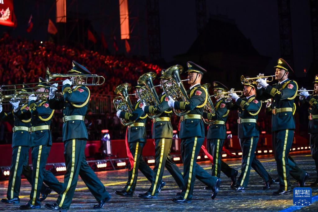 8月23日,在俄罗斯首都莫斯科,中国人民解放军仪仗司礼大队军乐团在军乐节上表演。