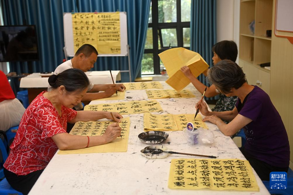 8月24日,在南宁市良庆区蟠龙社区文体活动室,居民在一起练习书法。