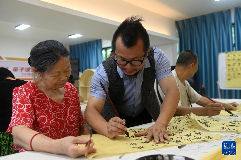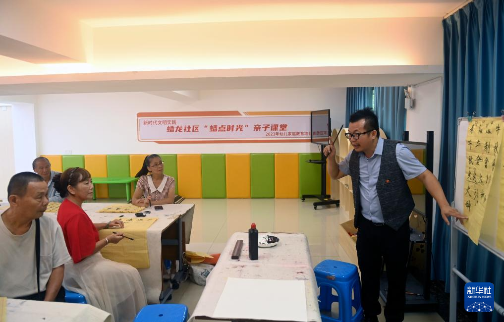 8月24日,在南宁市良庆区蟠龙社区文体活动室,居民在一起学书法。