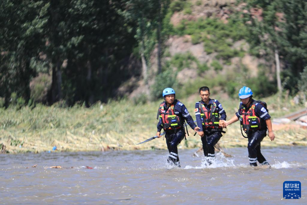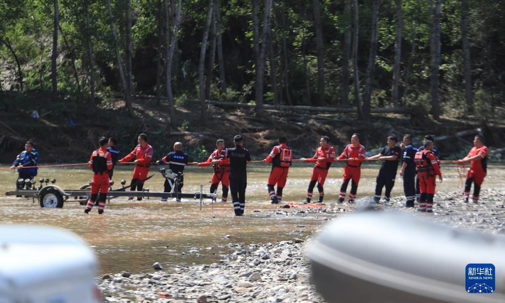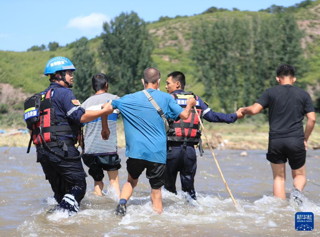 8月23日,在葫芦岛市建昌县黑山科乡,救援队员帮助受灾群众渡河后返回。
