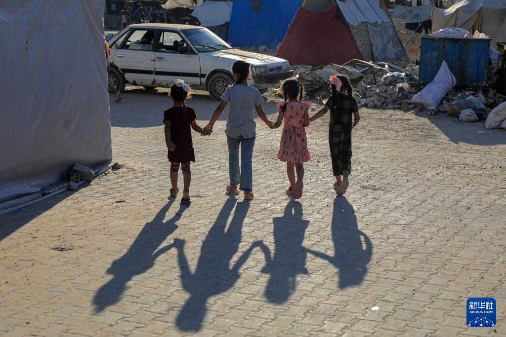 8月20日,在加沙地带南部城市汗尤尼斯,孩子们站在一处废墟旁。