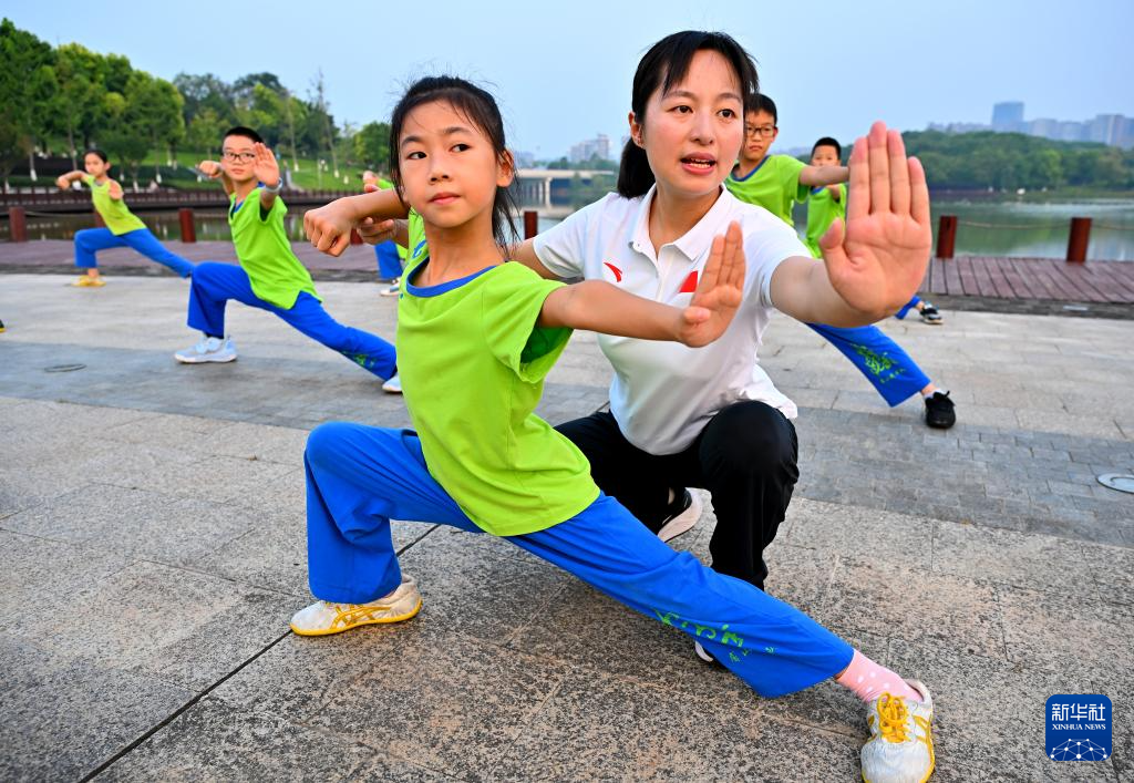 8月22日,四川省眉山市仁寿县武术传承人在指导学生练习武术。