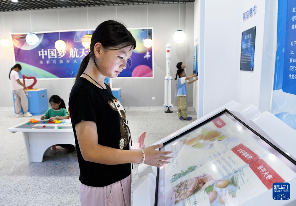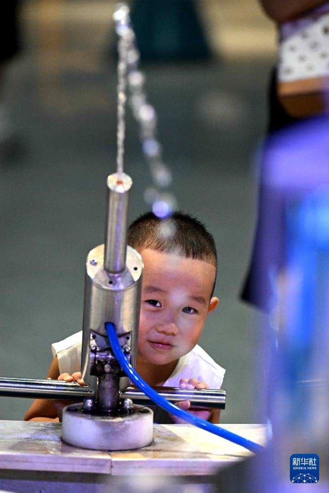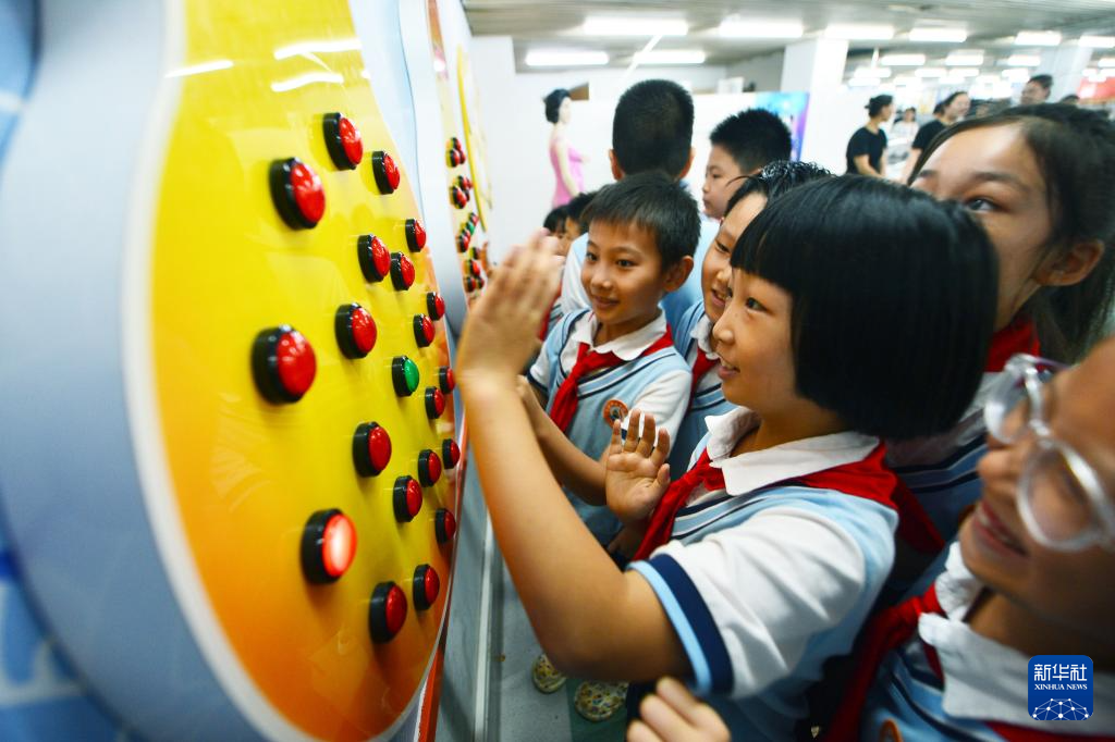 8月23日,小朋友在位于石家庄的河北省科技馆体验科普设施。