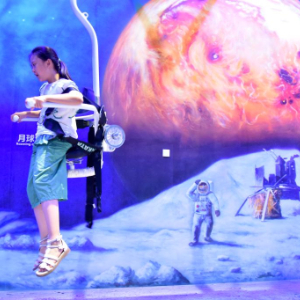 8月24日, 学生在山东省枣庄市科技馆“宇宙探索”厅体验月球漫步。