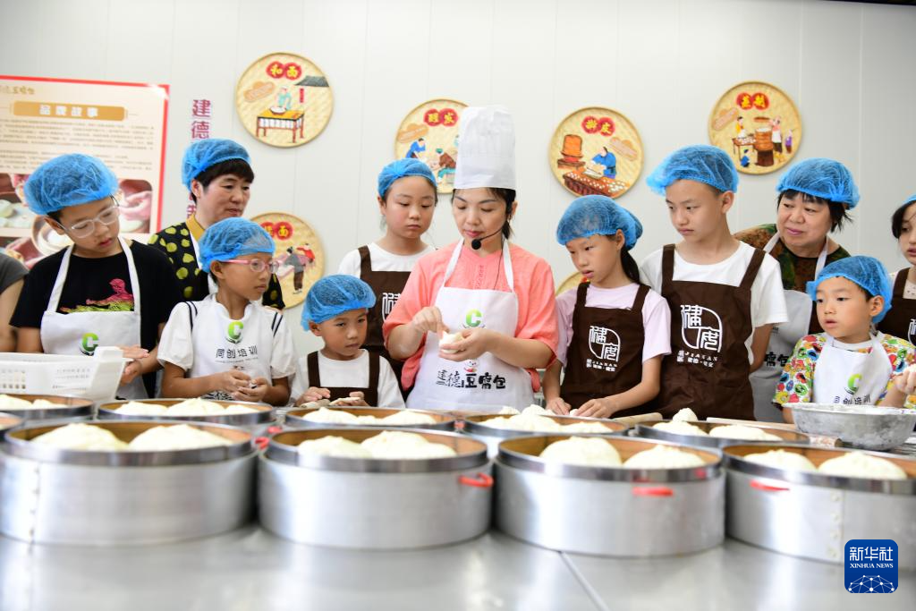 8月21日,在浙江省建德市新安江街道健安社区,孩子们跟着面点师傅学做传统手工豆腐包。