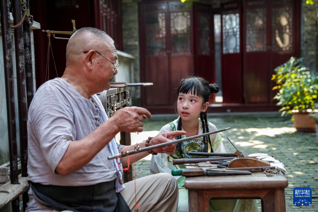 8月24日,在江苏省兴化市昭阳街道成氏宅第,小朋友在观看非遗传承人制作木杆秤。