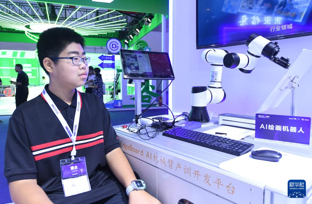 8月24日,在HICOOL 2024全球创业者峰会展览展示区,AI绘画机器人为观众画画。