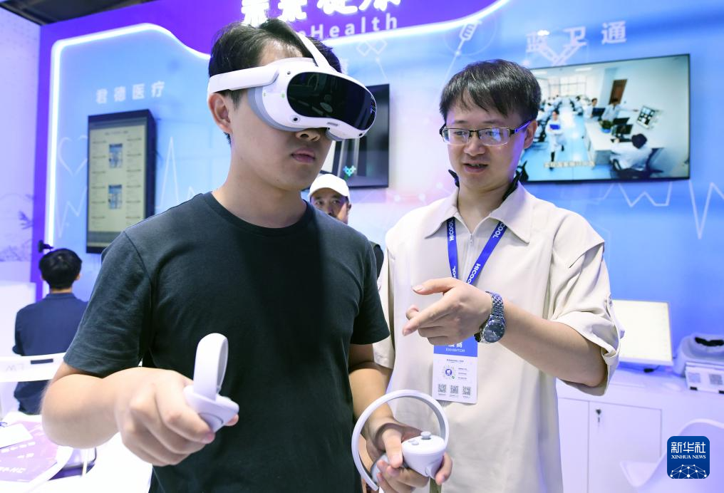 8月24日,观众(左)在HICOOL 2024全球创业者峰会展览展示区体验MR多人协同系统。