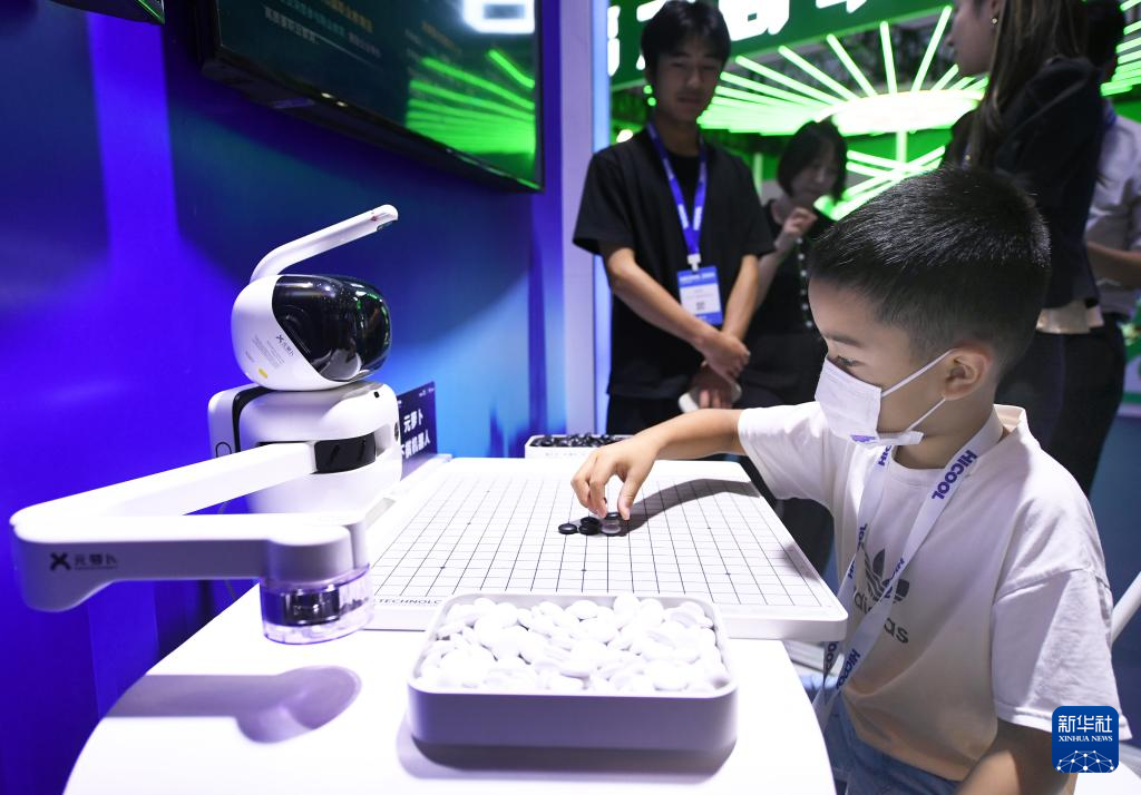 8月24日,小朋友在HICOOL 2024全球创业者峰会展览展示区与机器人下棋。