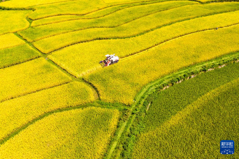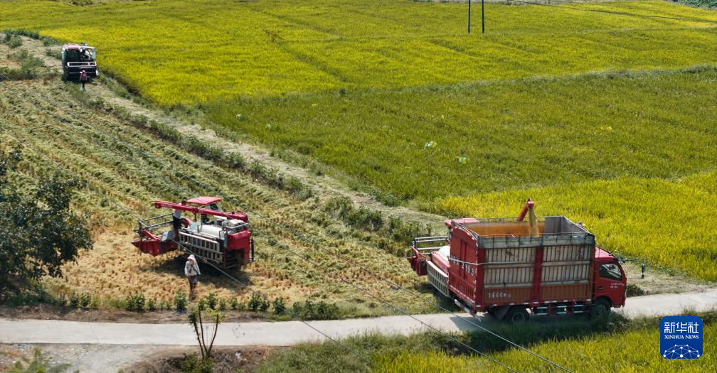 8月24日,在湖南省娄底市双峰县井字镇铜梁村,农民驾驶农机收割中稻(无人机照片)。