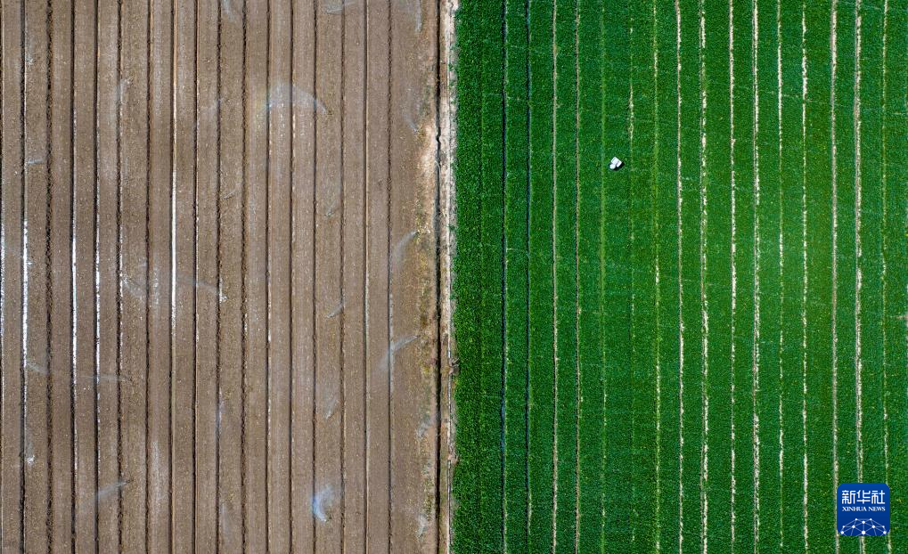8月23日,工作人员在宁夏青铜峡市瞿靖镇毛桥村蔬菜种植基地收获菜心(无人机照片)。