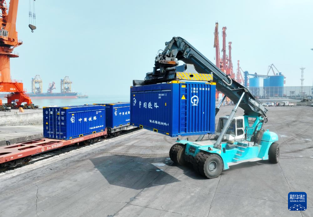 8月24日,在位于泉州市泉港区的肖厝港区沙格码头,作业人员将装载豆粕的新型通风集装箱吊上平板车。
