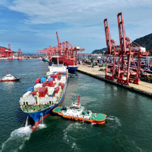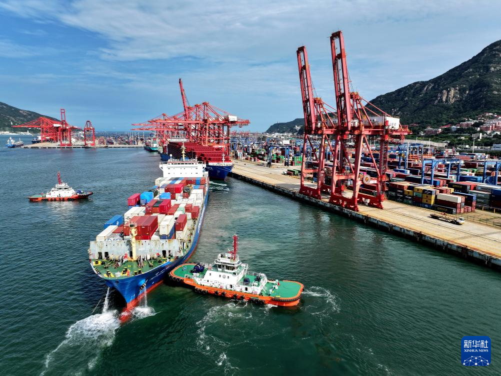 一艘货轮满载集装箱缓缓驶离江苏省连云港港集装箱码头泊位(8月15日摄,无人机照片)。