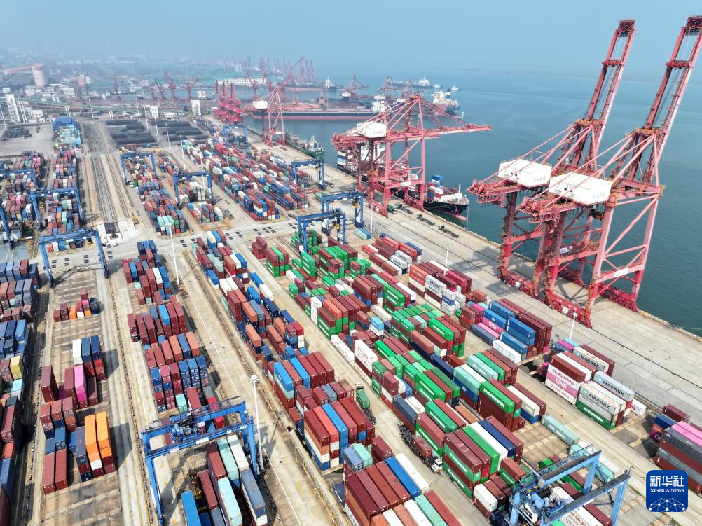 8月24日,在江苏省连云港港集装箱码头,货轮正在装卸集装箱(无人机照片)。