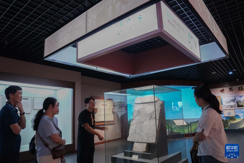 8月25日,在位于广西金秀的瑶族博物馆,馆长盘威(右二)向游客介绍《大瑶山团结公约》石碑。