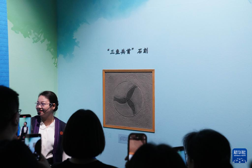 8月24日,讲解员在位于南宁的广西民族博物馆“铸牢中华民族共同体意识历史文化展”上介绍“三鱼共首”石刻图案 。